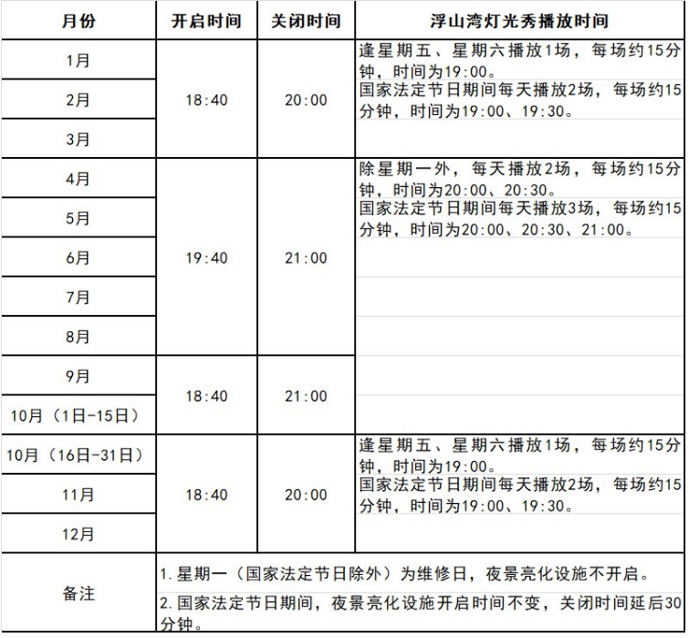 조명 쇼는 15분간 진행되며, 조명 레이저 쇼 진행 시간은 시기별로 다르다.